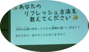 午後は、主に知的障害の方を対象に「あなたの休日の過ごし方・リフレッシュは?」と題して有給休暇のしくみや休みたい時に会社でどのように伝えるか?など休み方について、スライドを使いながら確認しました。茶話会では、リフレッシュの方法については一人ひとりがスポーツや旅行、カラオケなど様々な方法を発表し、参加者がお互いの話を楽しそうに聞いていたのが印象的でした 。
